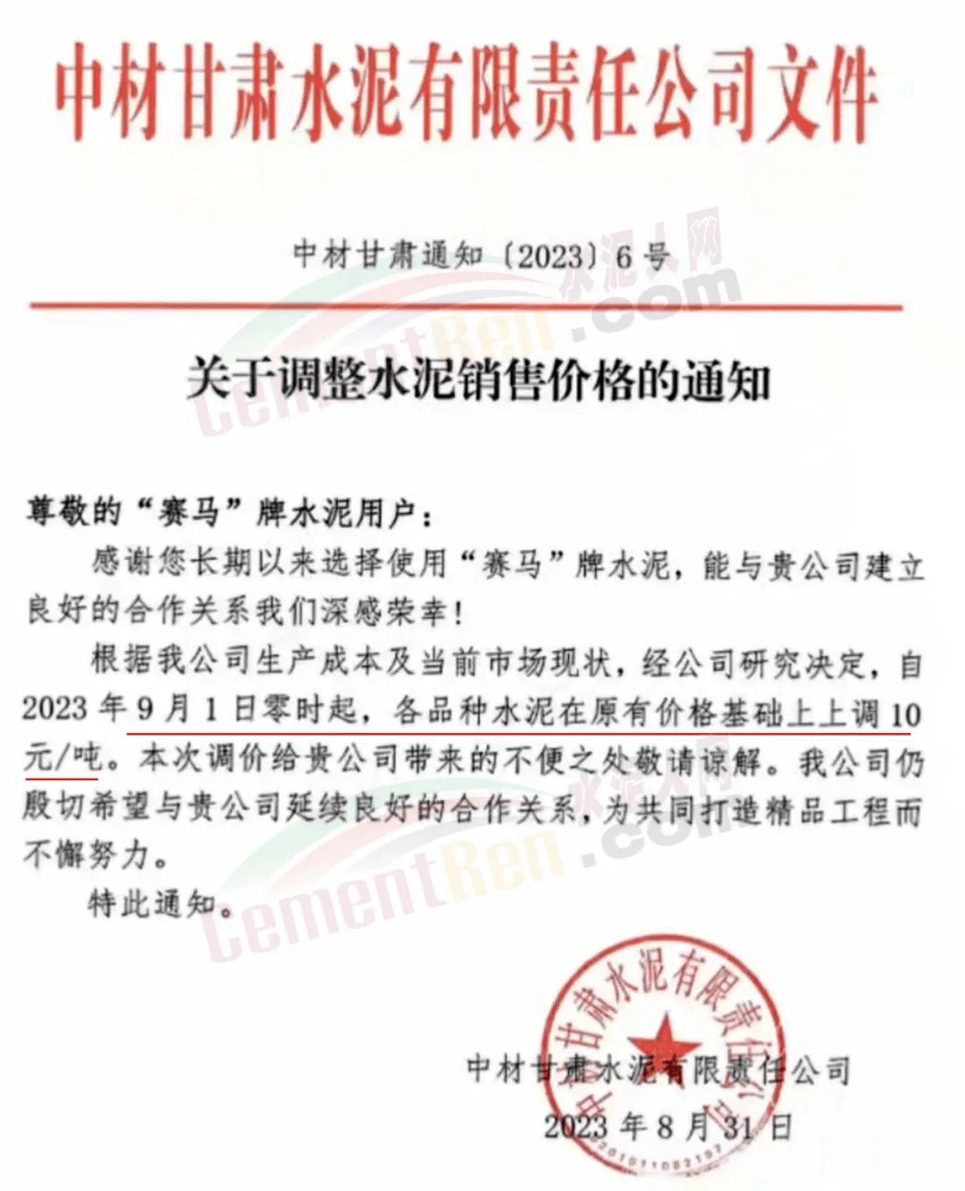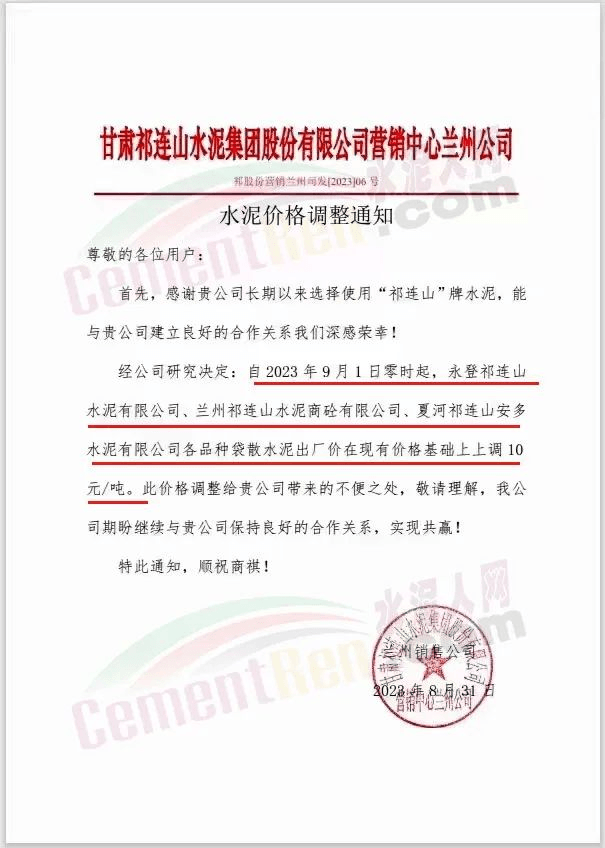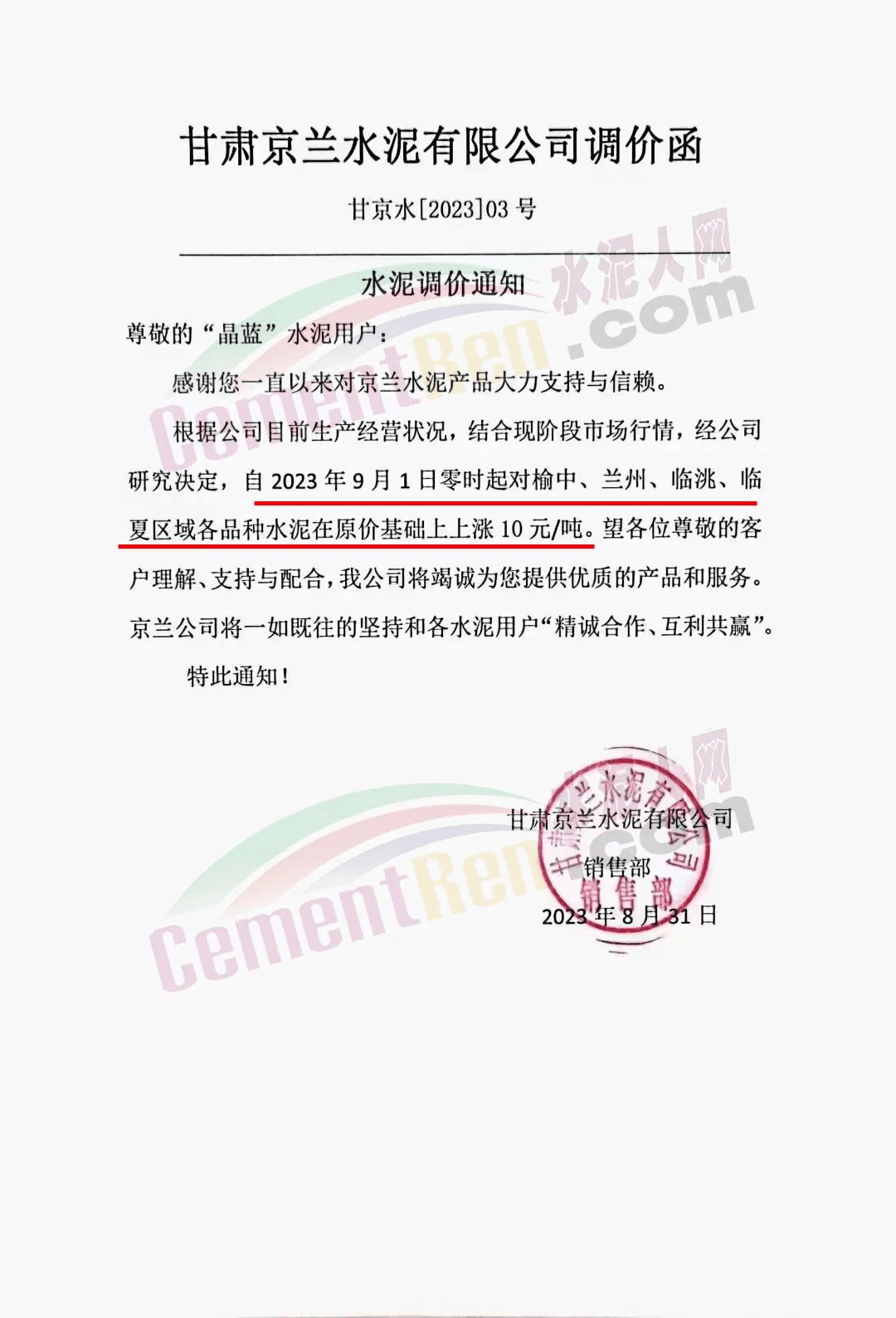 甘肅區域臨夏海螺水泥、甘肅京蘭水泥、三易水泥、中材甘肅水泥以及祁連山水泥天水公司、蘭州公司等主要品牌企業通知上調水泥價格10元/噸。