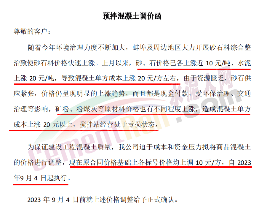 為保證建設工程混凝土質量,公司迫于成本和資金壓力擬將商品混凝土的價格進行調整,自2023年9月4日起在原合同價格基礎上各標號價格上調10元/方。