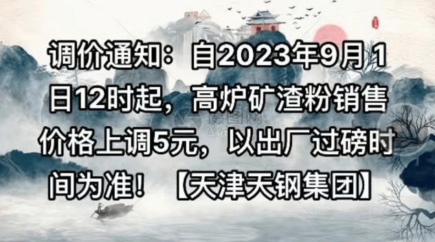 天津天鋼集團于9月1日和9月3日兩次通知上調高爐礦渣粉銷售價格,累計上調10元/噸,上調后S95散裝報價115元/噸。