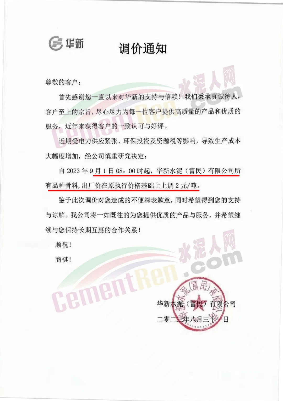 華新水泥(富民)有限公司通知稱,受電力供應緊張、環保投資及資源稅等影響,導致生產成本大幅度增加,經公司慎重研究決定:自2023年9月1日8時起,公司所有品種骨料出廠價在原執行價格基礎上上調2元/噸。