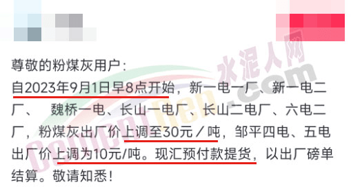 據山東貿易商通知,自2023年9月1日早8點開始,新一電一廠、新一電二魏橋一電、長山一電廠、長山二電廠、六電二廠,粉煤灰出廠價上調至30元/噸,鄒平四電、五電出廠價上調為10元/噸?,F匯預付款提貨,以出廠磅單結算。