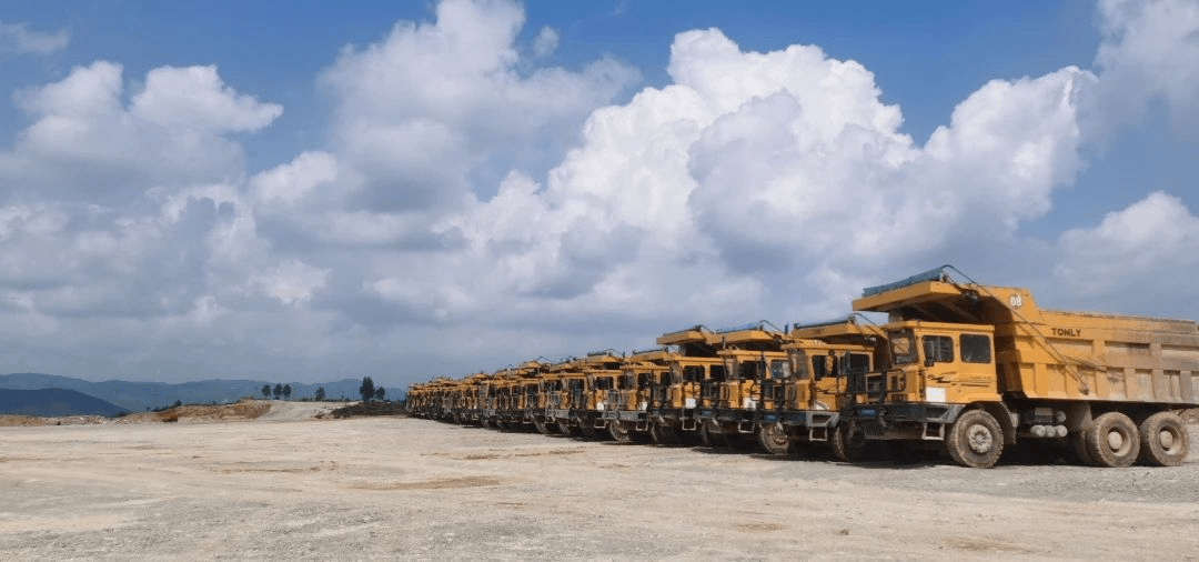 綠色礦山與蔚藍天空,礦車陣列譜寫宏偉畫卷
