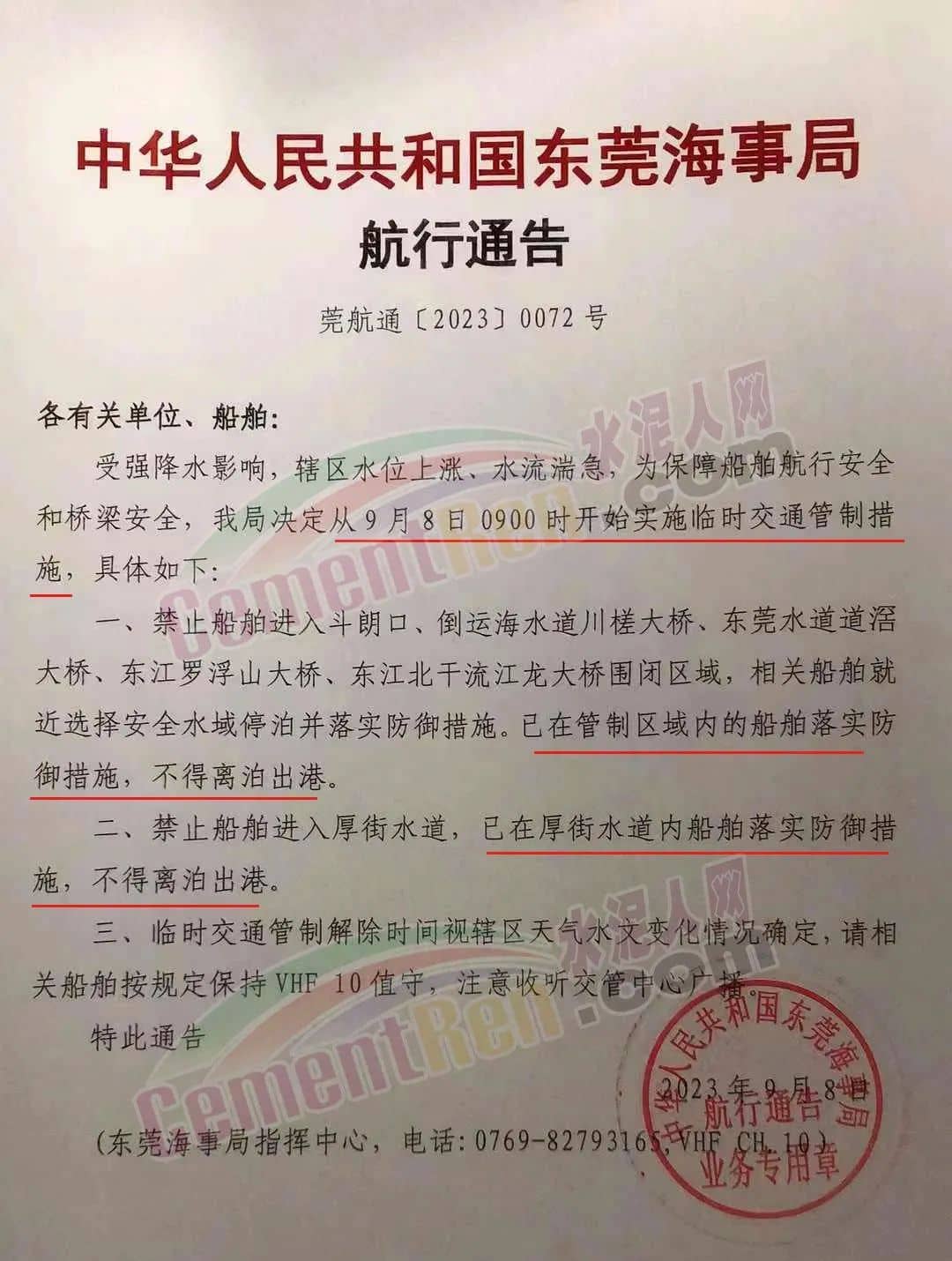 因暴雨、臺風影響,華南多地大宗物流停限運,施工工地及攪拌站停工停產,水泥發運量近零。水運物流方面,海事局發布臨時交通管制措施管制區內船舶禁止進入,已進入船舶不得離泊出港。