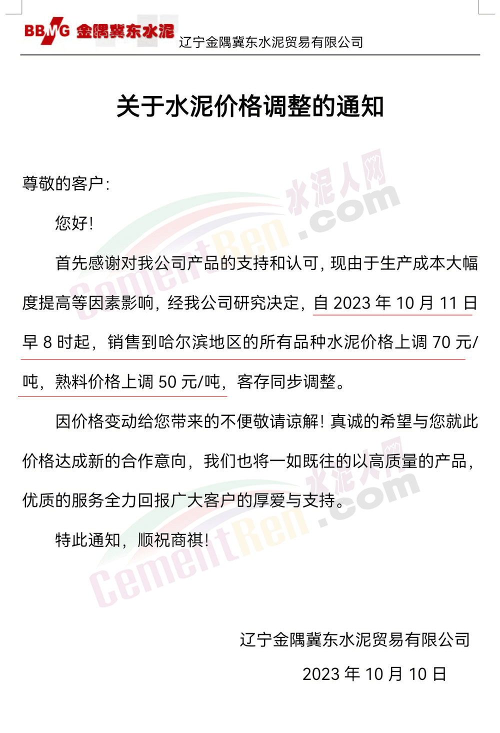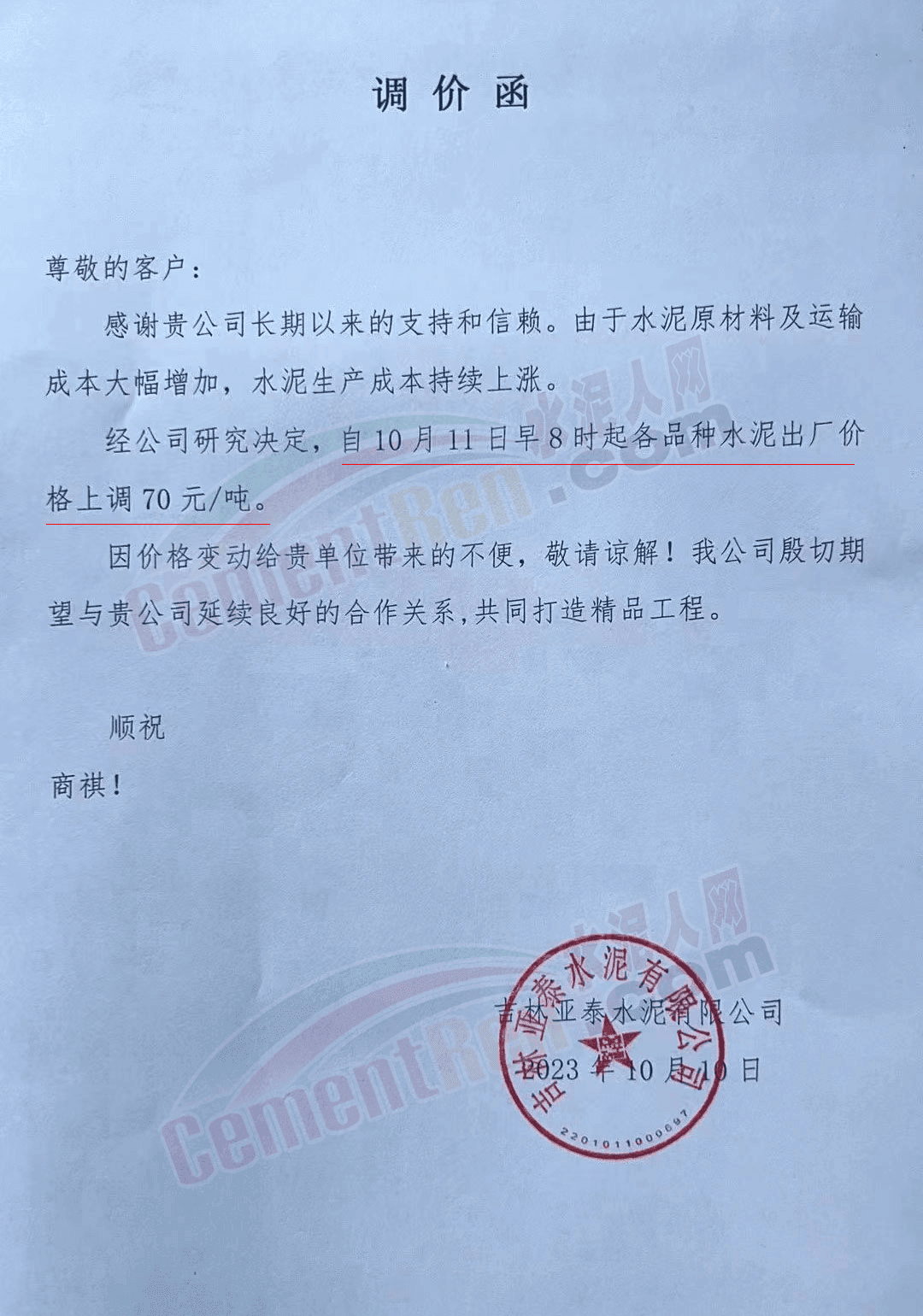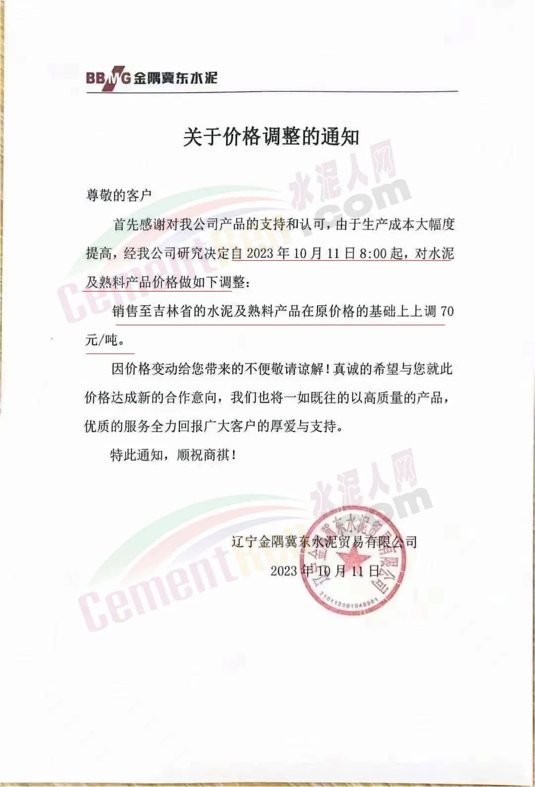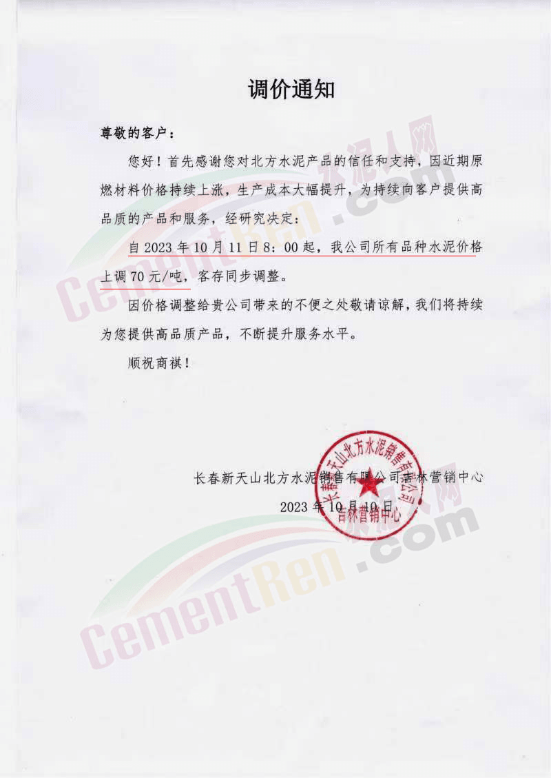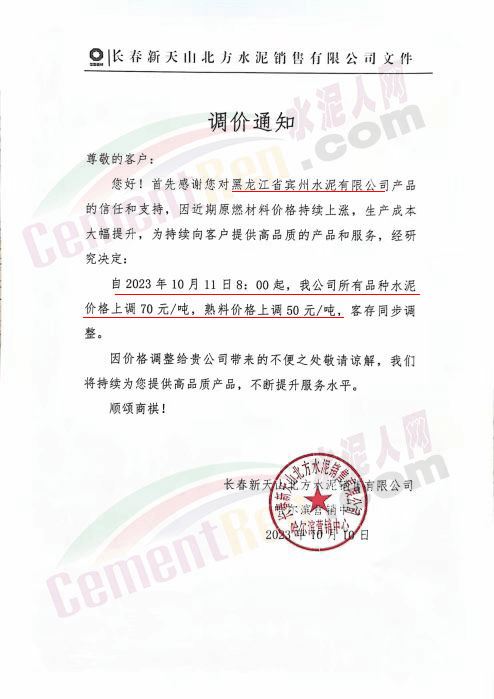 吉林區(qū)域,亞泰、北方、金隅冀東等企業(yè)通知上調水泥、熟料價格50-70元/噸。