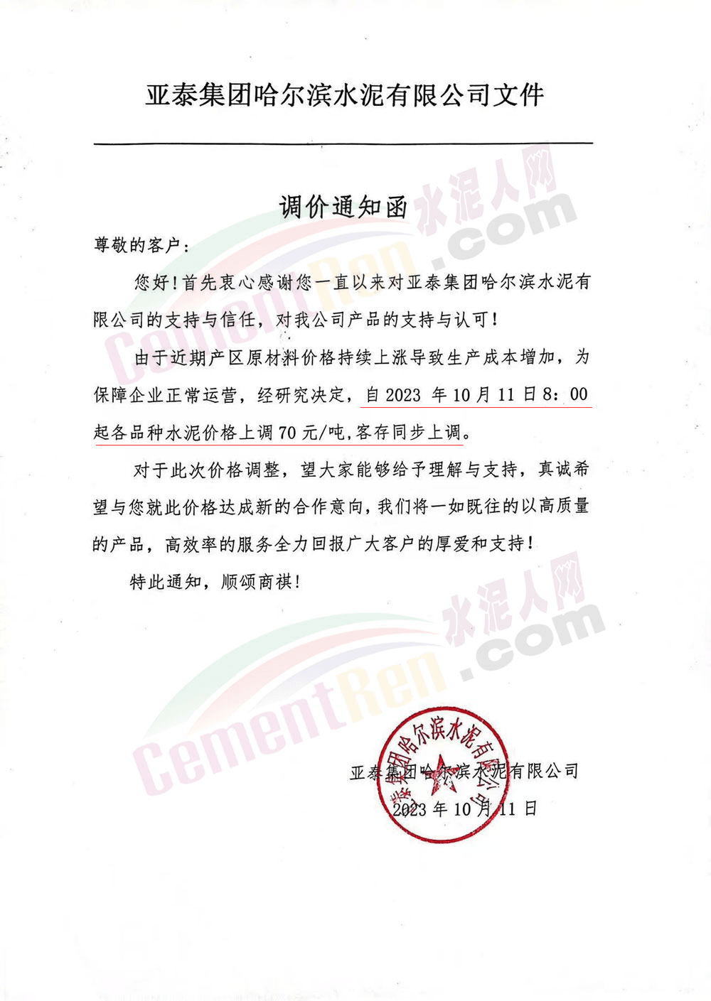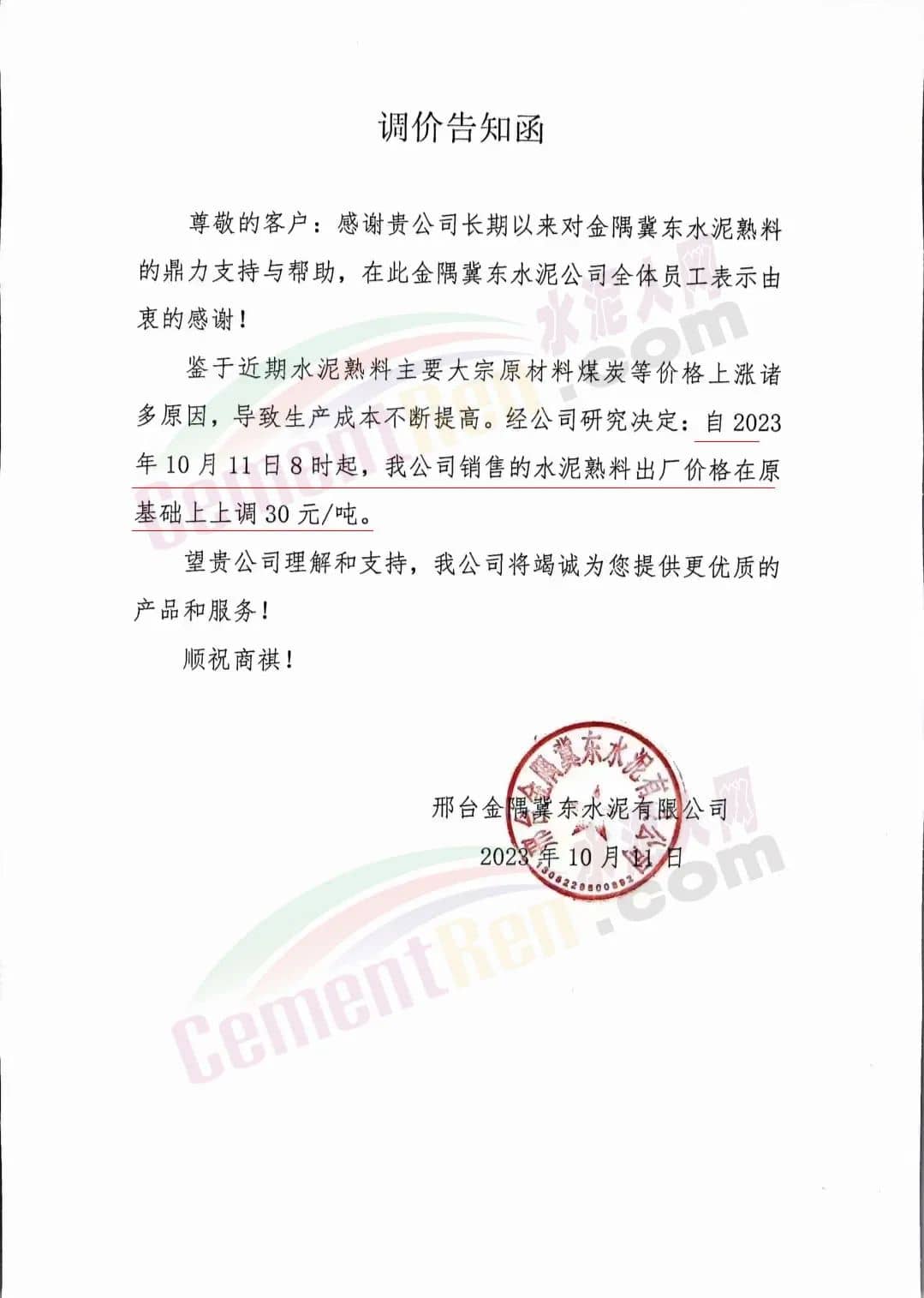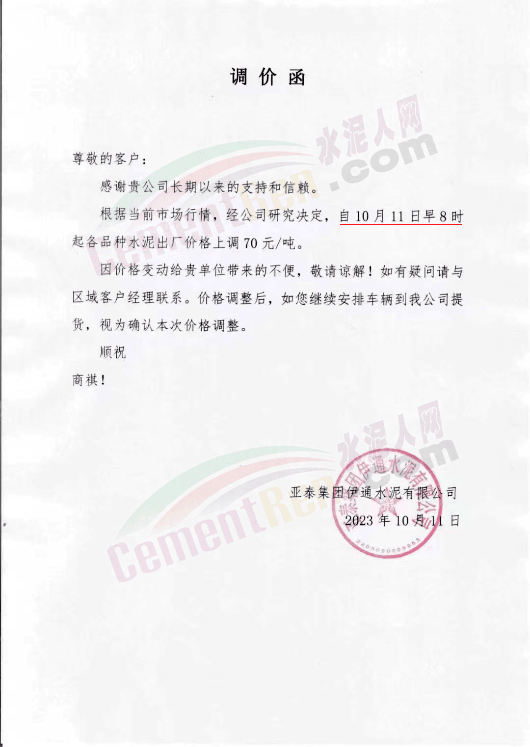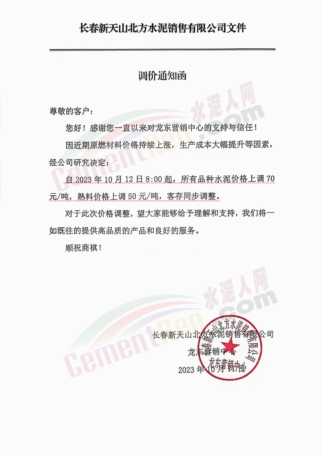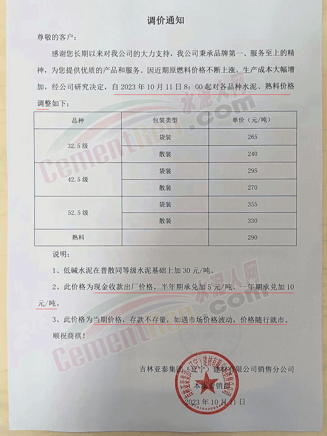 吉林區(qū)域,亞泰、北方、金隅冀東等企業(yè)通知上調水泥、熟料價格50-70元/噸。