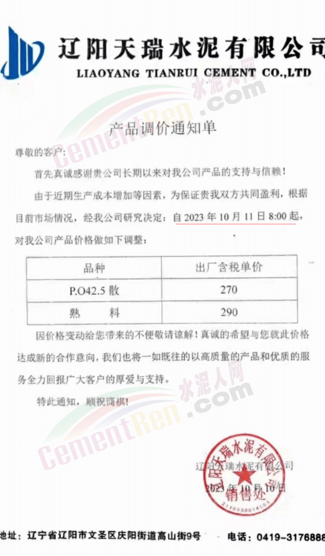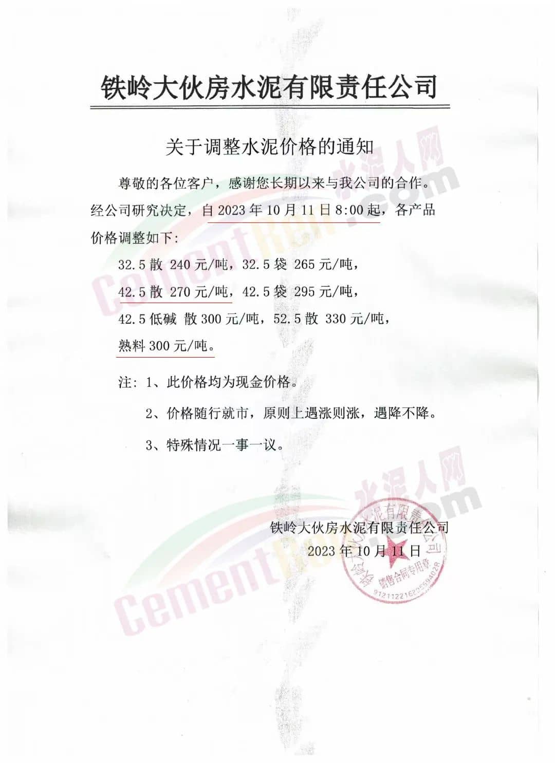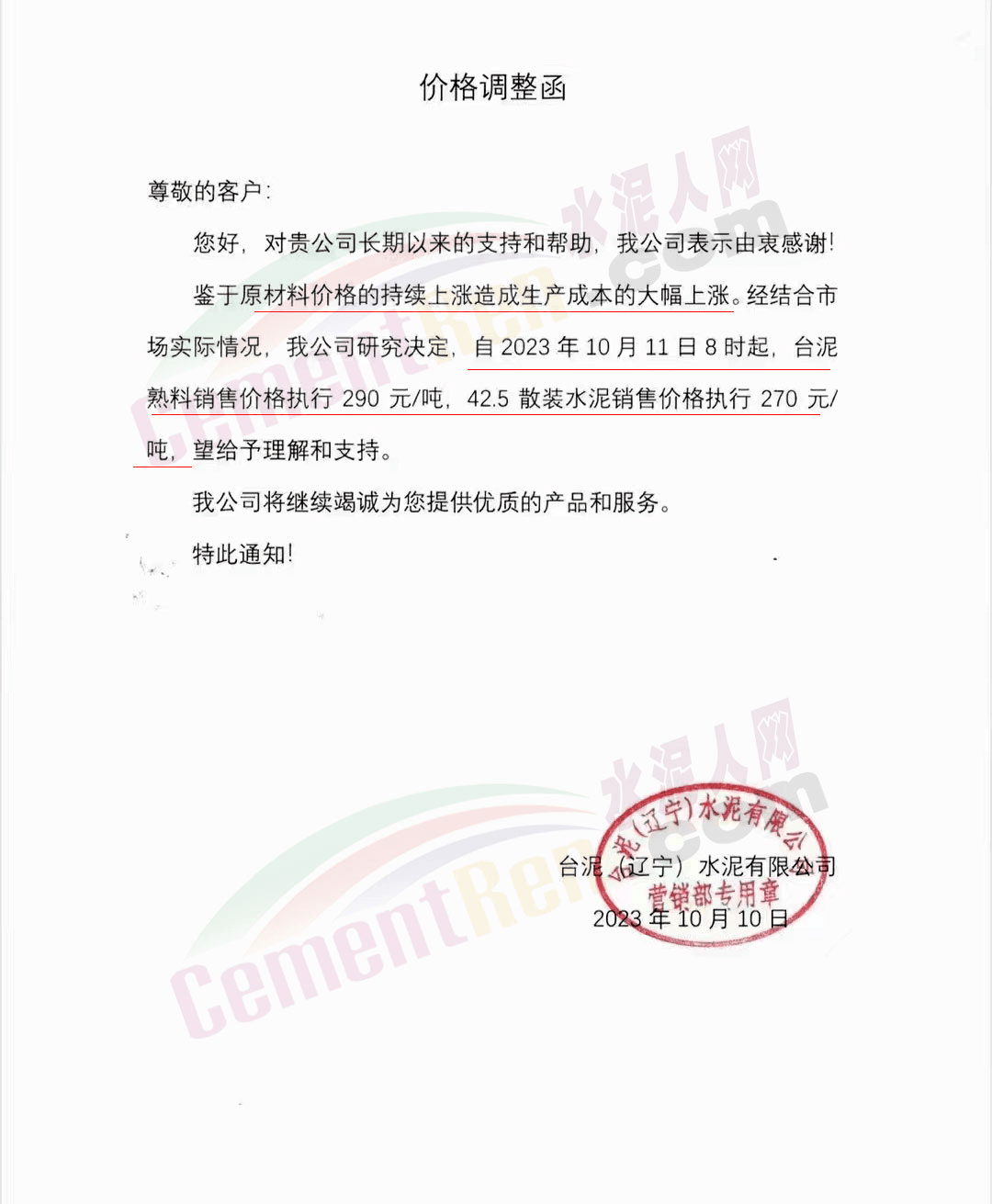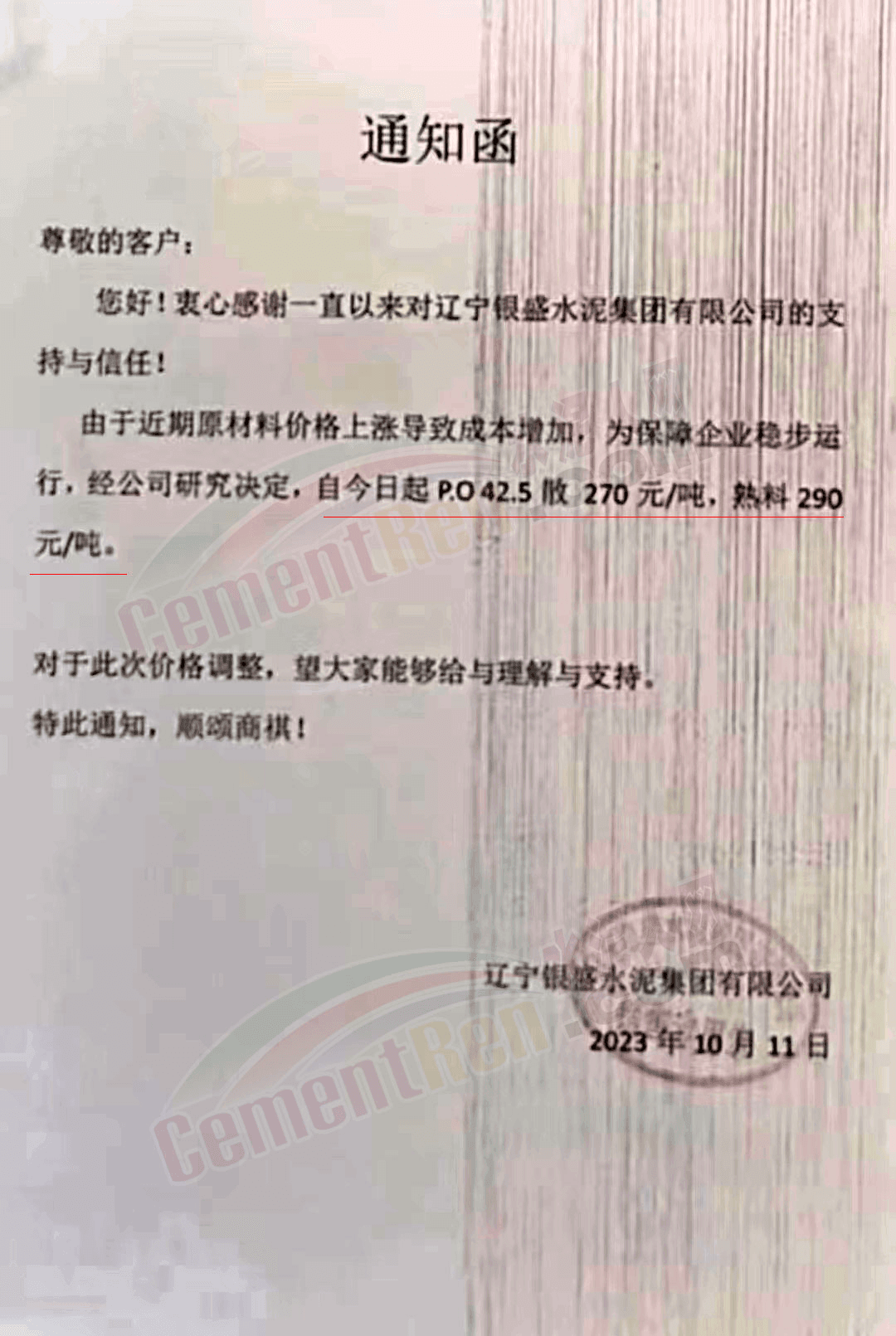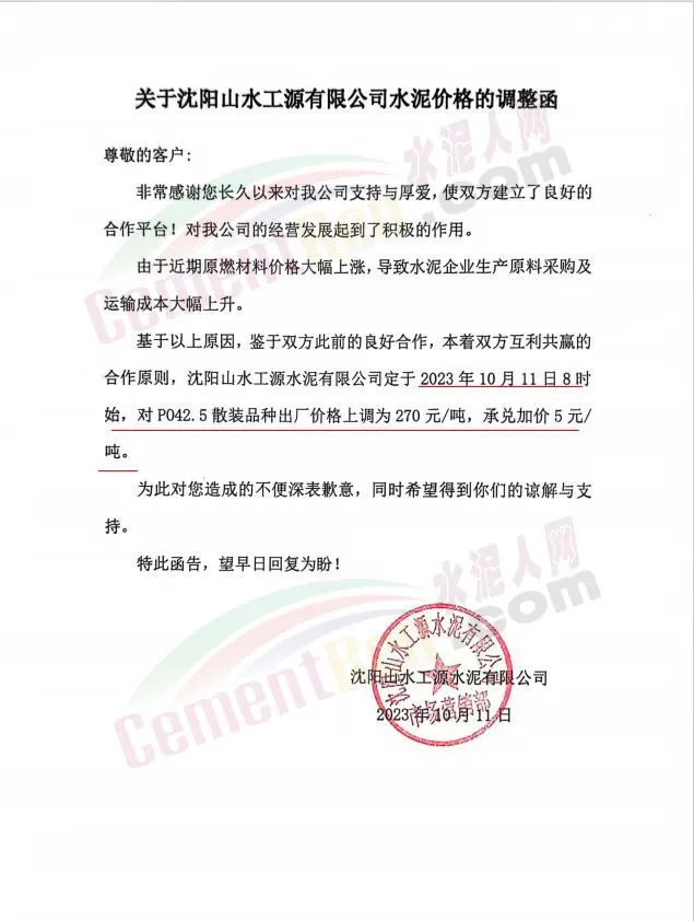 遼寧區(qū)域,吉林亞泰集團(遼寧)建材有限公司銷售分公司、天瑞水泥、山水工源、臺泥、銀盛、恒威、大伙房水泥等也通知調整水泥報價。調整后42.5級散裝水泥報價270元/噸,52.5散裝水泥報價330元/噸,熟料報價290~300元/噸。