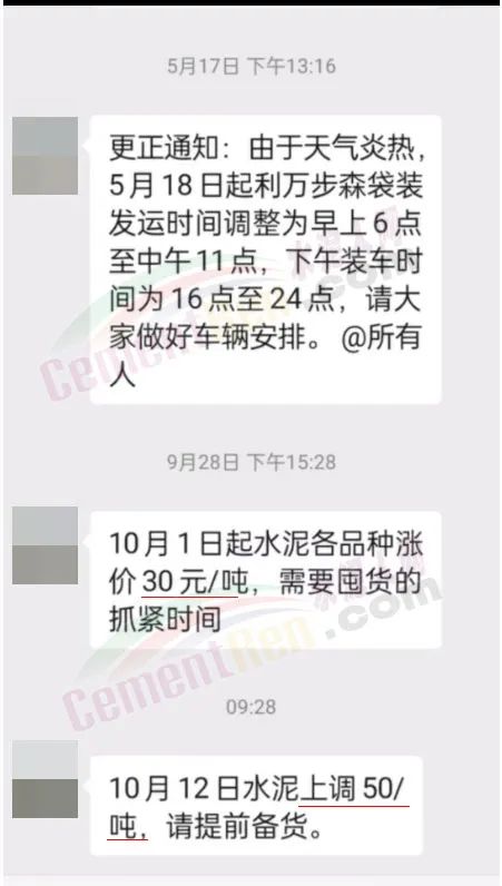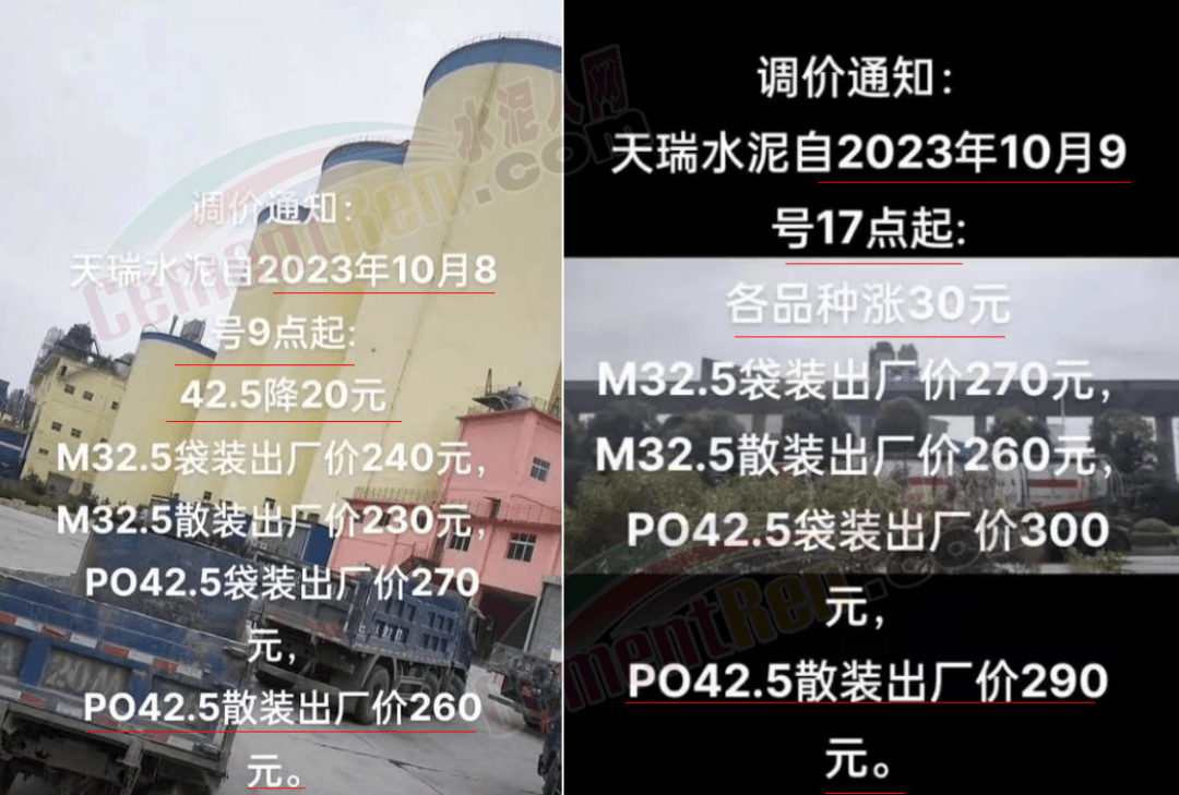 日前,河南地區(qū)主要品牌企業(yè)天瑞、中聯同力等通知上調報價30元/噸。當地經銷商反饋稱:企業(yè)通知10月8日9點降價20元/噸,降后P.O42.5散裝水泥出廠報價260元/噸;10月9日17點又通知上調30元/噸,上調后P.O42.5散裝水泥出廠價報290元/噸。變價像“川劇變臉”一樣快。