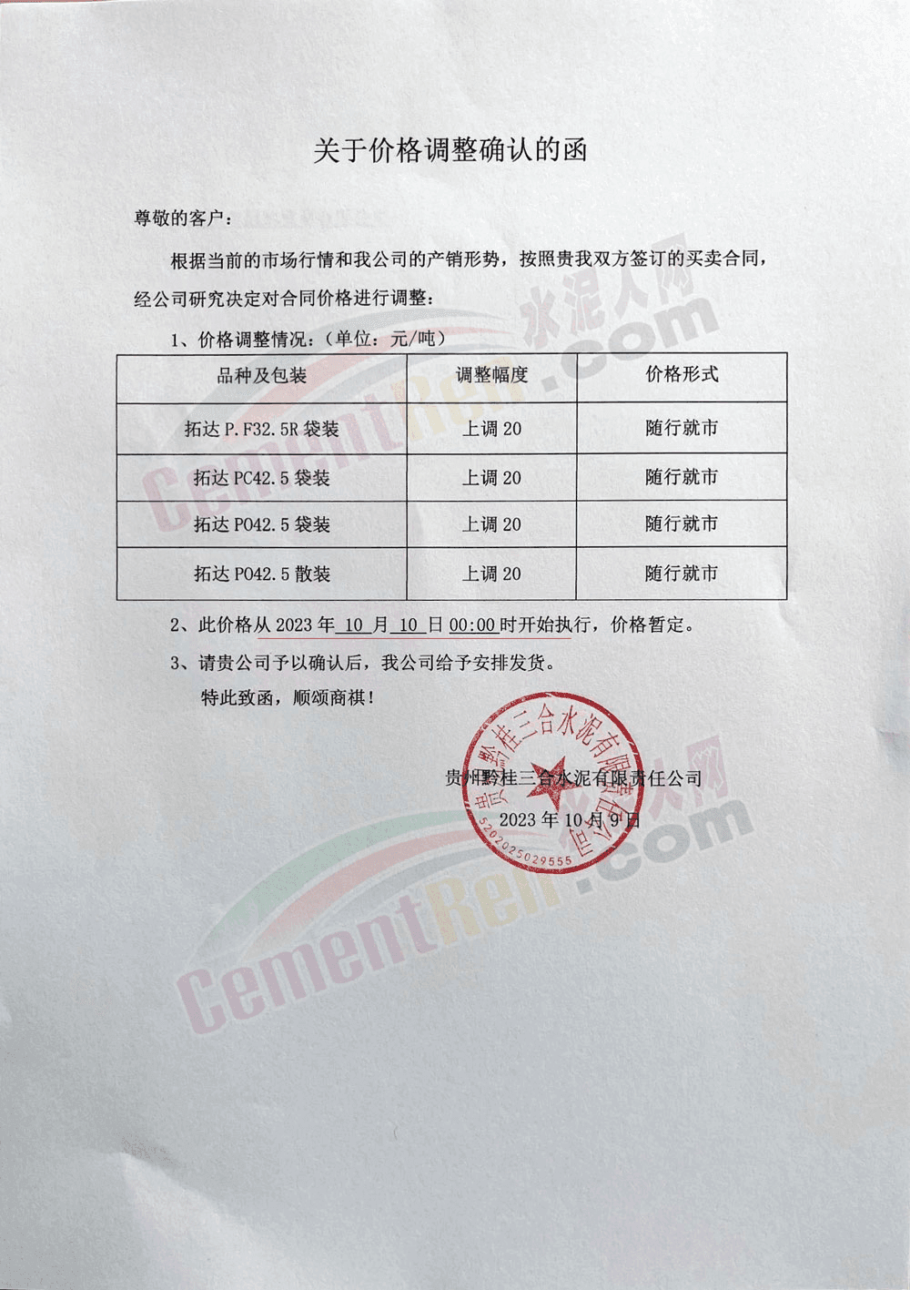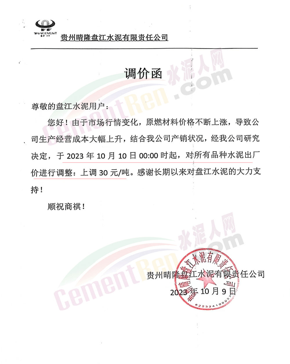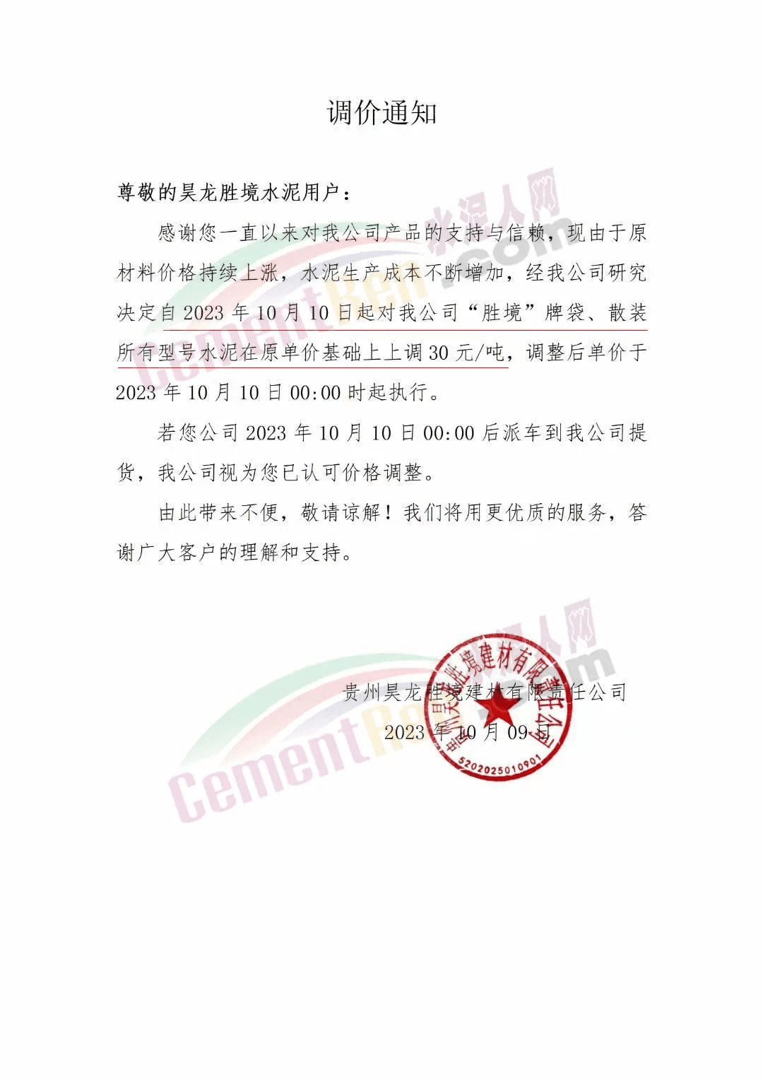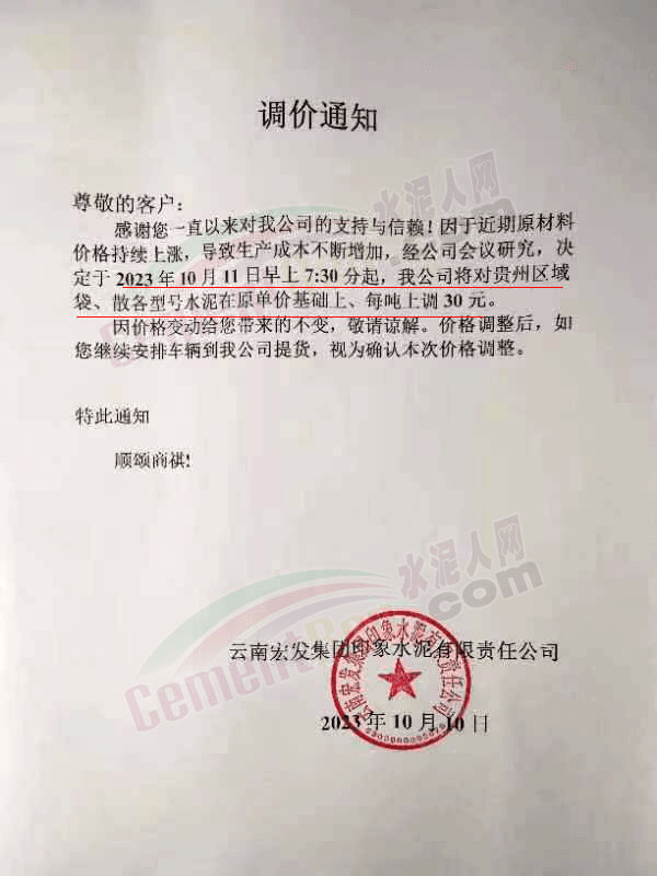 貴州區(qū)域多家企業(yè)通知上調水泥報價30元/噸。