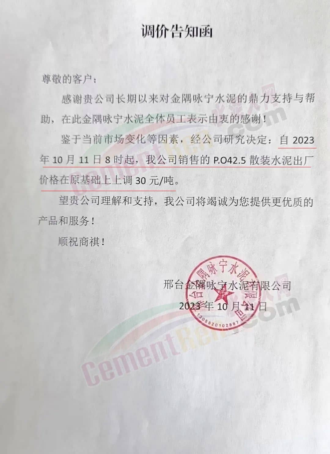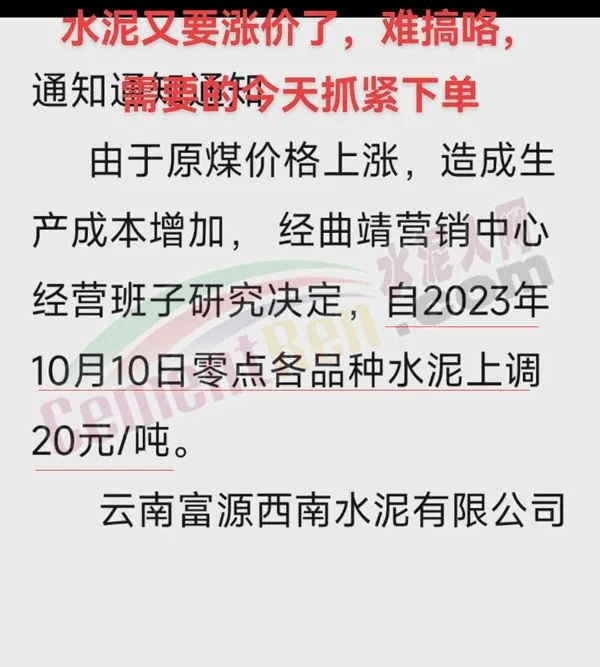 四川區(qū)域主要品牌水泥企業(yè)銷售經理通知,將于12日起上調水泥報價50元/噸。