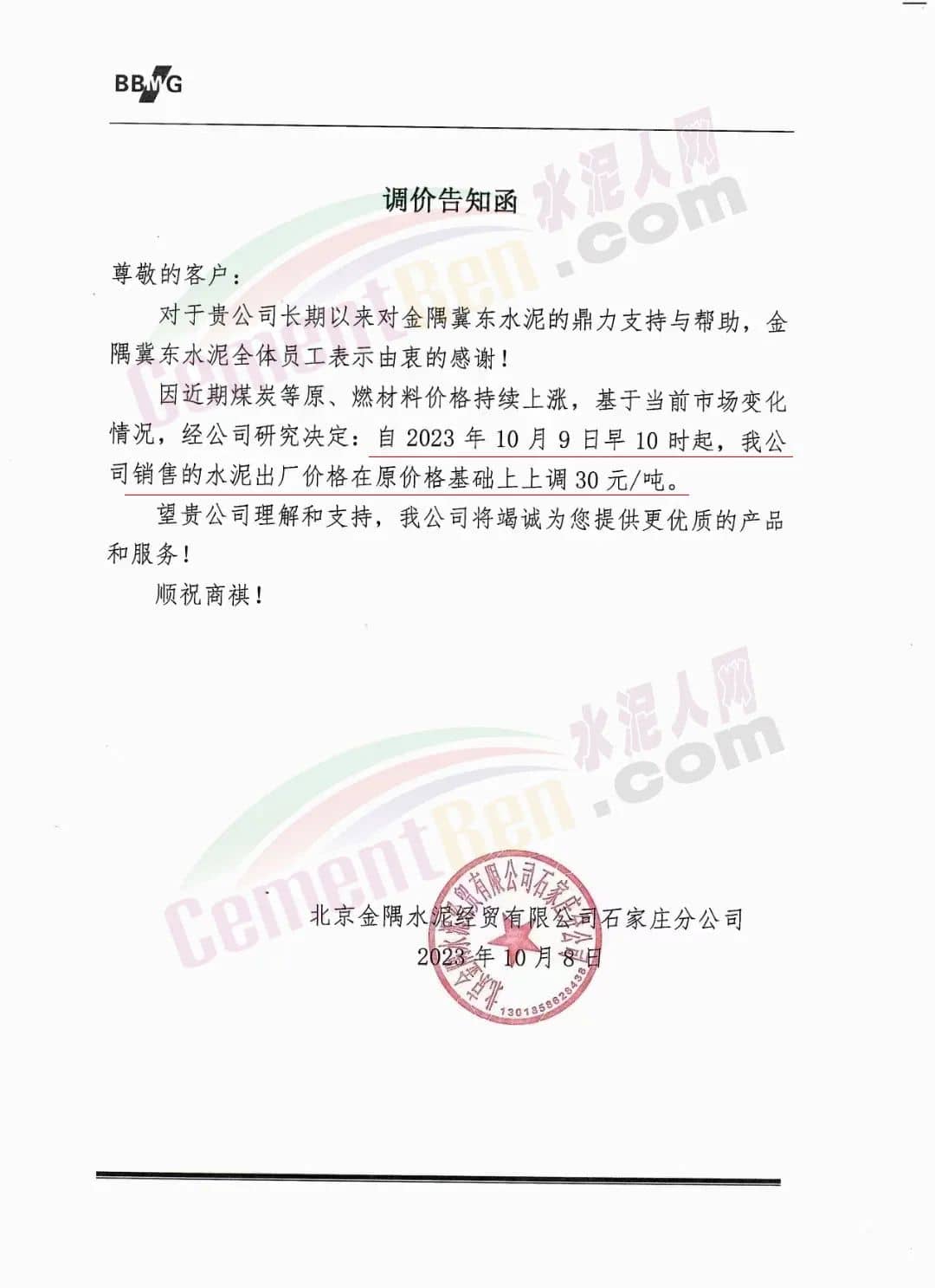 京津冀地區(qū),北京金隅水泥石家莊分公司、邢臺金隅冀東水泥有限公司、邢臺金隅詠寧水泥有限公司等主要品牌企業(yè)通知上調水泥、熟料報價30元/噸。
