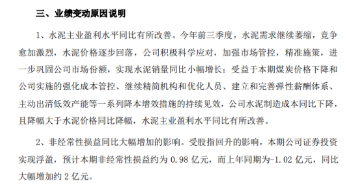 公司業績預增原因中提及受益于煤炭價格下降和公司實施的強化成本管控、繼續精簡機構和優化人員、建立和完善彈性薪酬體系、主動出清低效產能等一系列降本增效措施的持續見效,公司水泥制造成本同比下降,且降幅大于水泥價格同比降幅,水泥主業盈利水平同比有所改善。