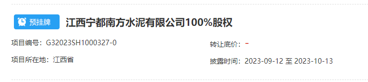 日前,江西南方水泥有限公司100%控股企業江西寧都南方水泥有限公司100%股權在某交易平臺公布預掛牌。