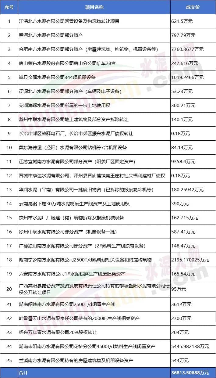 今年以來已成交的22個項目中不僅包含閑置的設備及構筑物,土地使用權,還包括整條生產線以及相關企業的股權、債權。其中蕪湖海螺水泥有限公司所屬的一宗土地使用權以300.21萬元成交;湖南耒陽南方水泥有限公司花橋分公司4500t/d熟料生產線閑置資產以5445.982138萬元成交;紹興萬年青水泥有限公司20%股權以204萬元成交。云南昆鋼下屬30萬噸水泥粉磨生產線資產及土地使用權,以390萬元成交。已成交的25個項目成交金額合計3.68億元。