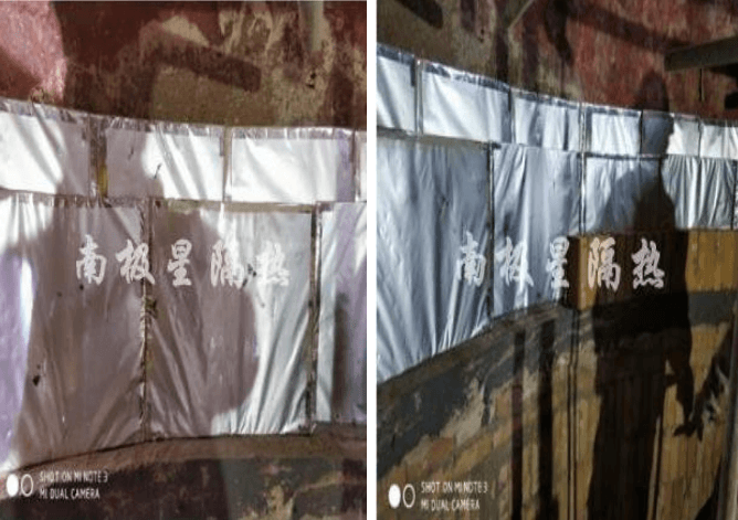 施工中,35mm納米隔熱板分兩層施工,一層25mm粘貼于鋼殼上,然后施工10mm的隔熱氈,兩層隔熱板錯縫施工。采用35mm納米隔熱板代替100mm的硅酸鈣板,內部直徑增加130mm,容積增加了32立方米,外殼溫度由原來的120℃下降到80℃,降溫幅度為40℃,擴容和節能效果明顯,同時50天就收回了投資。