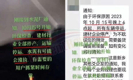 河南水泥企業通知,由于環保原因2023年10月15日晚上6點起,所有車輛停運、建材企業停產。