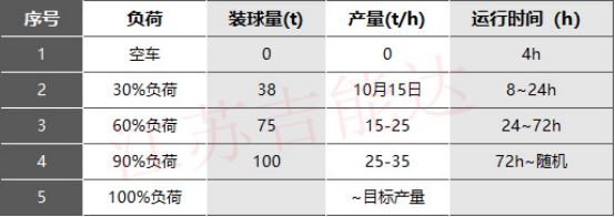 試車階段時間(h)裝球量(t)產量(t/h)(由吉能達公司現場人員調配)