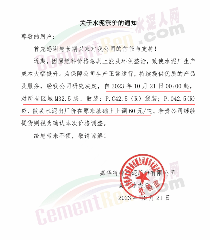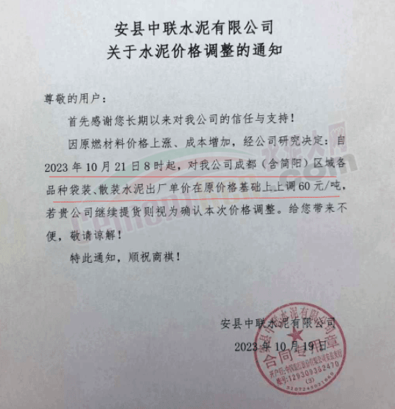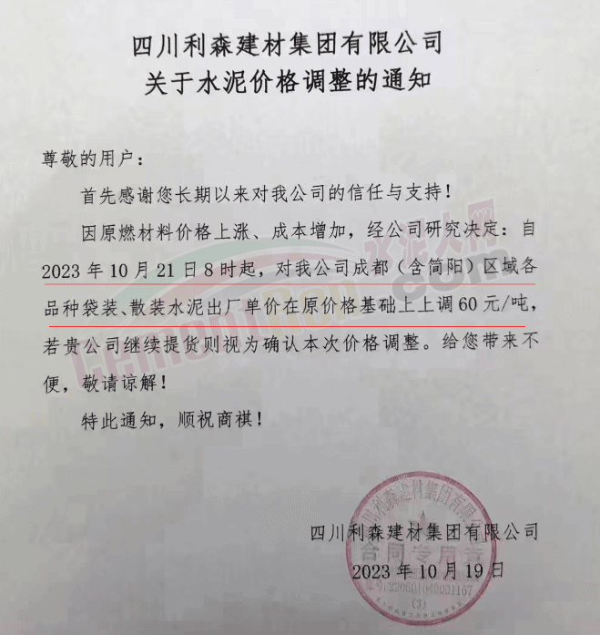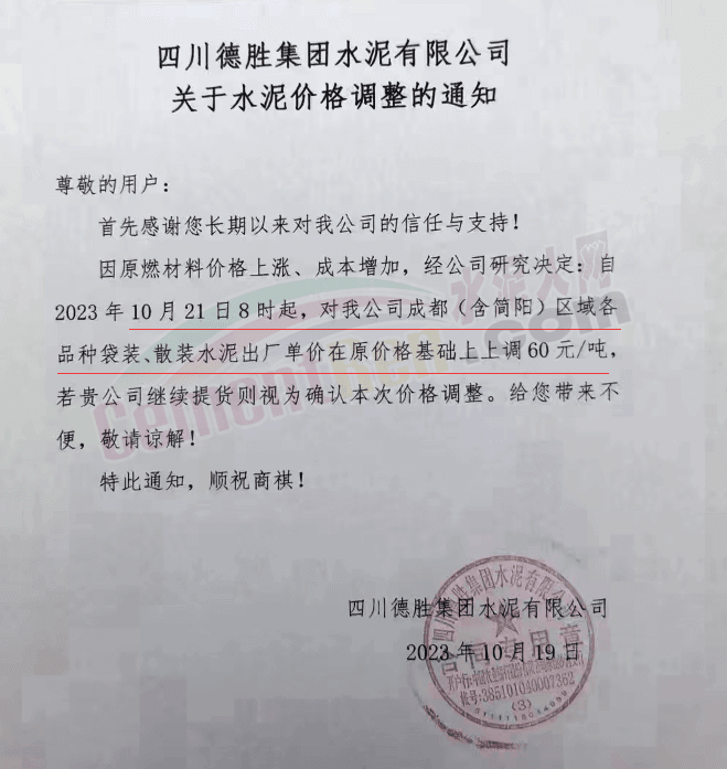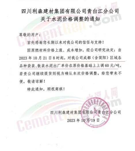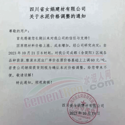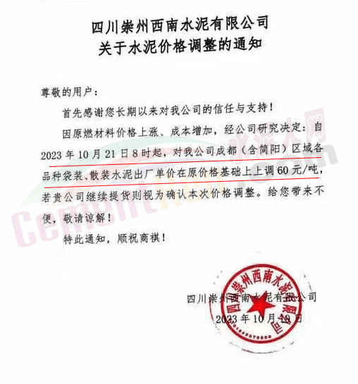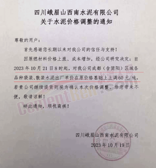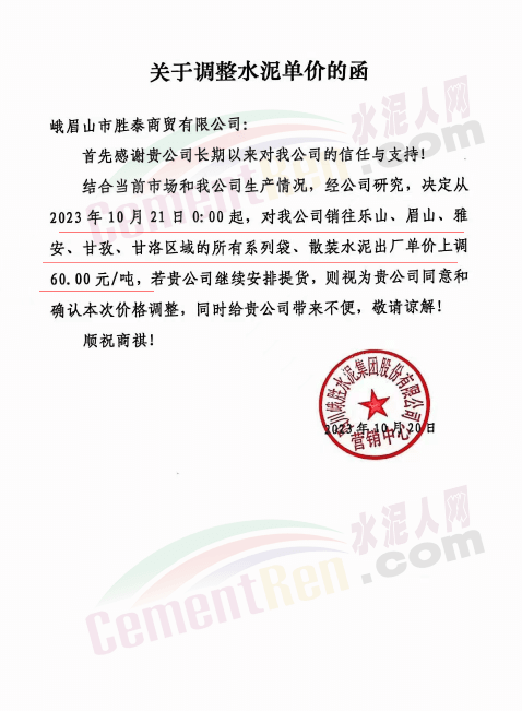水泥人網(wǎng)通訊員消息:日前,四川大成都區(qū)域主要品牌企業(yè)通知自2023年10月21日起上調(diào)各品種水泥出廠價60元/噸。