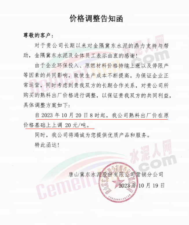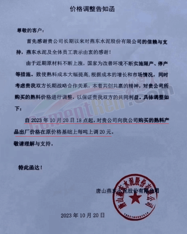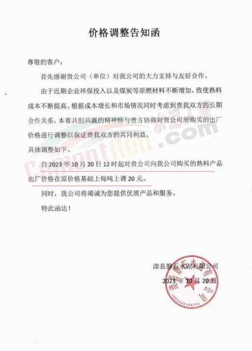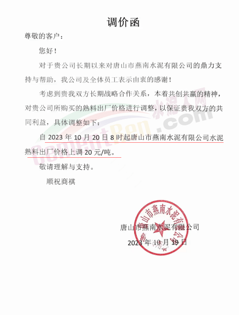 同期,河北唐山冀東水泥、耀東水泥、燕東水泥、燕南水泥、磐石水泥等多家企業(yè)通知上調(diào)熟料報價20元/噸。