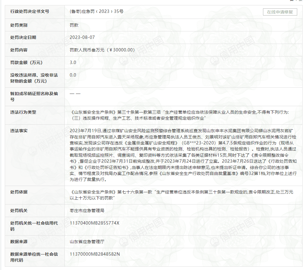 今年8月7日,棗莊市應(yīng)急管理局依據(jù)《山東省安全生產(chǎn)條例》曾對申豐水泥公司處以3萬元罰款。處罰原因?yàn)椋浩髽I(yè)水泥用灰?guī)r礦存在非礦用自卸汽車進(jìn)入露天采場現(xiàn)象。