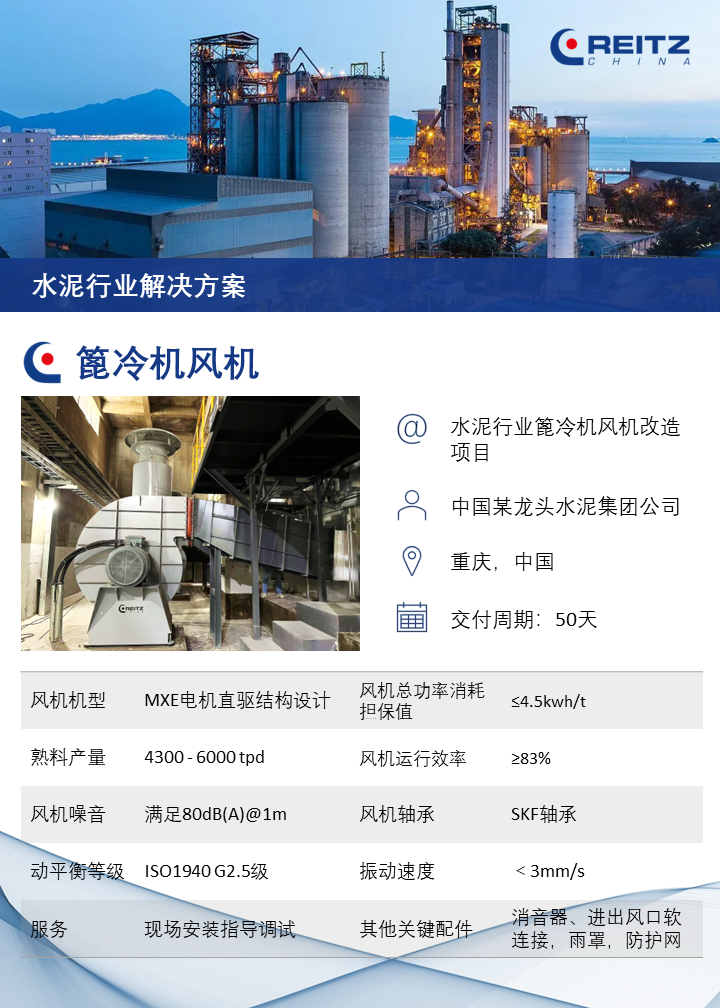 銳志風(fēng)機(jī)憑借優(yōu)秀的技術(shù)設(shè)計(jì)和精湛的制造工藝,幫助該客戶(中國(guó)北方最大的水泥生產(chǎn)商和供應(yīng)商)在篦冷機(jī)風(fēng)機(jī)改造項(xiàng)目中,順利實(shí)現(xiàn):