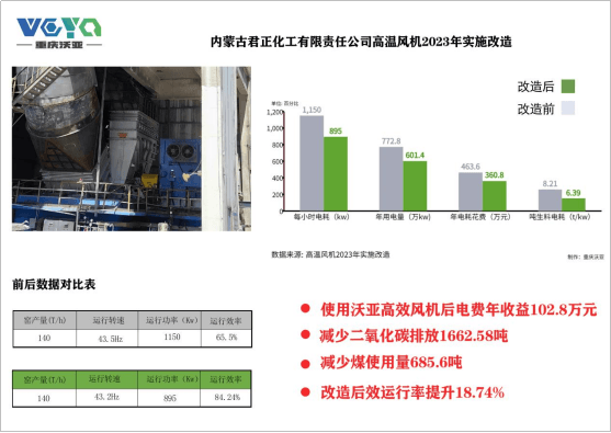 內(nèi)蒙古君正化工有限責(zé)任公司水泥分公司的高效節(jié)能高溫風(fēng)機(jī)技改項(xiàng)目通過(guò)沃亞高效風(fēng)機(jī)的應(yīng)用,不僅取得了顯著的經(jīng)濟(jì)效益,還為環(huán)境保護(hù)和資源節(jié)約做出了積極貢獻(xiàn)。這一項(xiàng)目的成功案例表明,投資于技術(shù)改進(jìn)和節(jié)能措施不僅有助于企業(yè)提高競(jìng)爭(zhēng)力,還有助于社會(huì)的可持續(xù)發(fā)展。以下是詳細(xì)數(shù)據(jù)說(shuō)明: