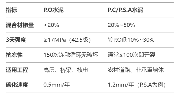從執行標準的角度來說,P.O(普通硅酸鹽水泥)、P.S.A(礦渣硅酸鹽水泥A型)和P.C(復合硅酸鹽水泥)在成分、性能及適用范圍上存在顯著差異。