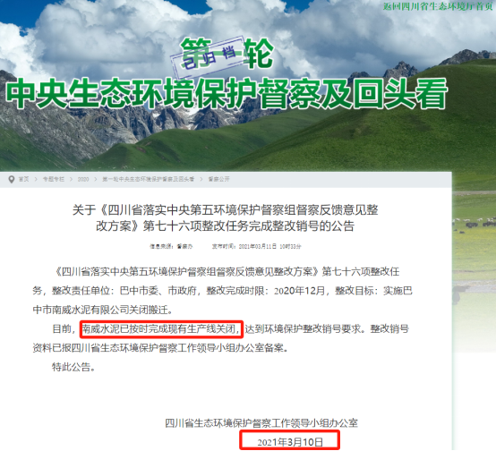 根據四川省生態環境保護督察工作領導小組辦公室2021年3月11日發布的關于【《四川省落實中央第五環境保護督察組督察反饋意見整改方案》第七十六項整改任務完成整改銷號的公告】顯示,截至2021年3月10日,南威水泥已按時完成現有生產線關閉,達到環境保護整改銷號要求。