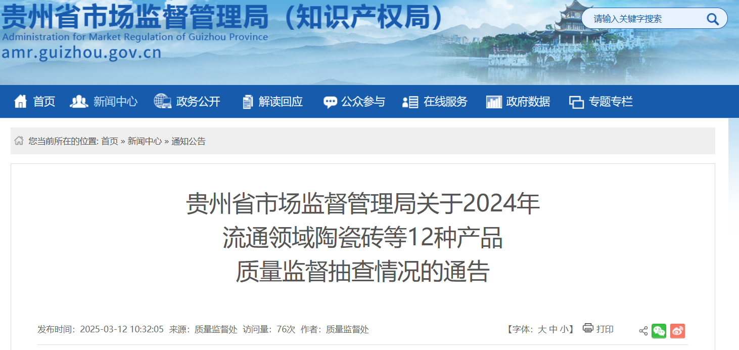 質(zhì)量監(jiān)督抽查情況的通告》稱,根據(jù)相關(guān)法律法規(guī)和有關(guān)工作部署,貴州省市場(chǎng)監(jiān)督管理局近期組織開展了流通領(lǐng)域陶瓷磚等12種產(chǎn)品質(zhì)量監(jiān)督抽查。